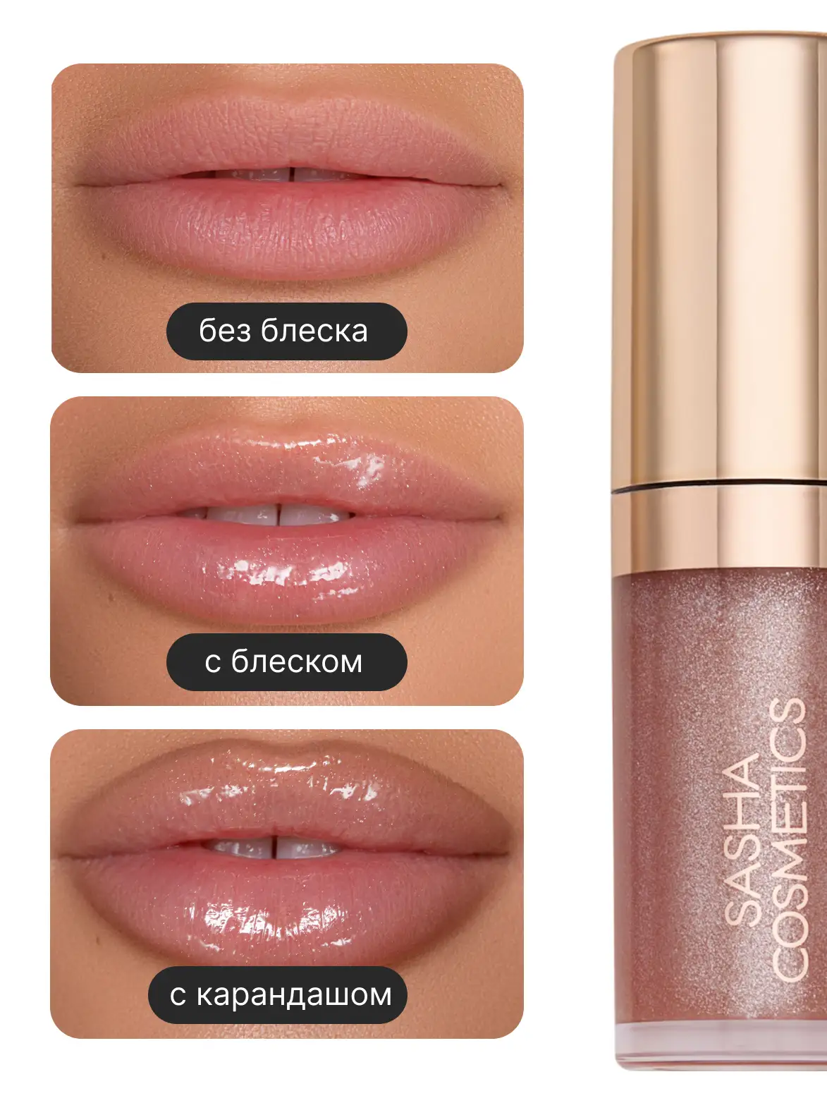 Масло-блеск от SASHA COSMETICS придаст губам выбранный вами оттенок, а также будет идеально сочетается с любыми помадами и карандашами, не размывая их текстуру. Витаминный комплекс из 3х масел мгновенно улучшает состояние губ и избавляет от сухости.