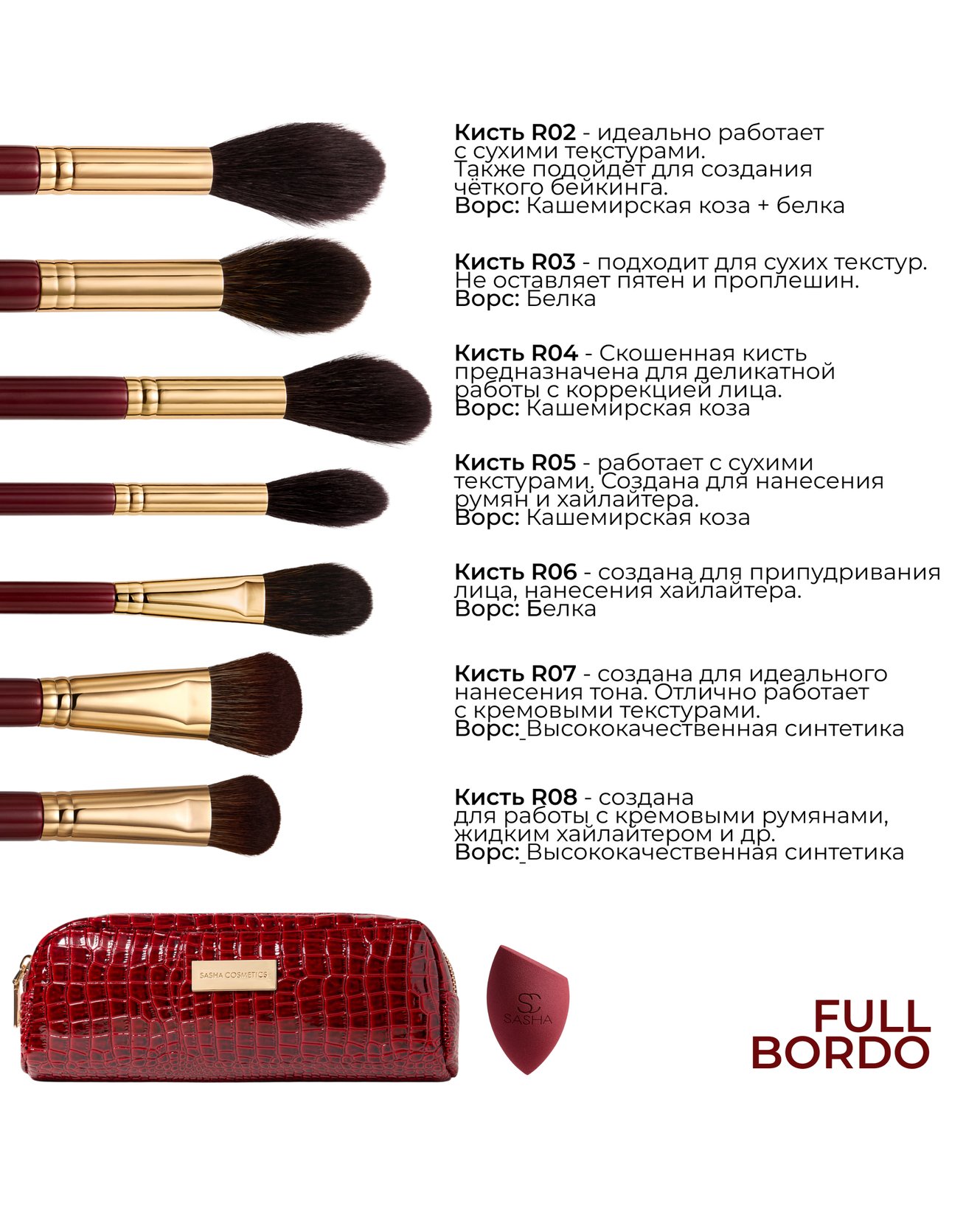 Премиальный набор кистей "BORDO" включающий в себя все кисти серии "BORDO". В набор входят 13 кистей: